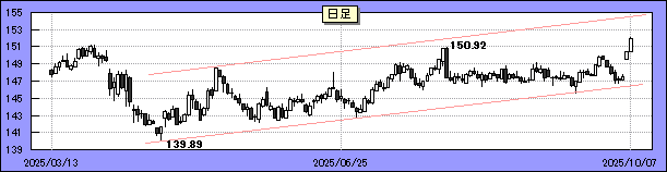 ドル・円が下げ渋って21日線を絡んでくるようだと相場のもみ合い色が再び濃くなる。このときの上値ポイントは想定されるチャンネル上辺、或いは200日移動平均線だ。200日線は目先、148.60/65レベルを下がってきそうだ。200日線が破られると150.92を狙う動きに要注意となる。