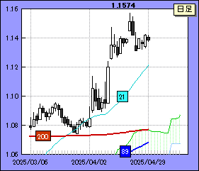 想定されるもみ合い圏は上限を89日線、下限を1.1470レベルとするゾーンだ。現水準からまだ下限まで下値余地を残しているのでその点は注意が必要だ。89日線は目先、1.16台半ばで横ばい推移すると予想される。