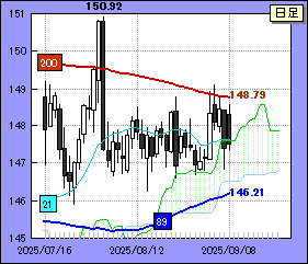 相場を取り巻く状況にまるで変化がないのでこれまで通りの見方に固執せざるを得ないだろう。つまり、想定されるもみ合い圏は89,200日線に挟まれた領域。この領域からはみ出したあとのターゲットは上値が150.92、下値は142.69だ。目先、200日線は148.90/149.00レベルを下がりそう。89日線は145.85/95レベルを上がってくると予想される。両移動平均線を破るのは簡単ではなさそうだが、もみ合い相場はいつかは崩れるので油断は禁物である。