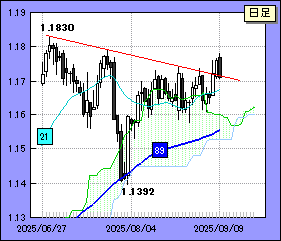 今週に入ってユーロ・ドルは左図に示した抵抗線を上抜け昨日は1.1780まで上昇した。しかし、弾みをつけることができず上値を押さえ込まれたあと反落。今朝の市場では午前10:30現在、1.1690/95付近での値動きとなっている。