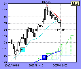 相場の流れが転換したとのシグナルはまだ得られていないが、そうなる可能性が徐々に高まりつつあるようだ。下値の焦点は21日移動平均線。同移動平均線は本日の終値が155.21ならば同じ値をとる。破られると157.90で当面の天井を見たとの判断が有力となる。このとき、153.60レベルへの下値余地に要注意だ。