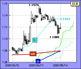 [1.1919⇒1.1469]の下げ幅に対する61.8%戻し(1.1747)を達成したユーロ・ドルの次の狙い目は76.4%戻しに相当する、1.1810/15レベルだ。そこで上げ止まらないようだと1.1919が狙われる。他方、下値については21,89日移動平均線とサポートラインが幅広いサポート帯を形成する。ユーロ・ドルが特に二本の移動平均線に絡んでくれば、相場のもみ合い色が一段と強まる。21日線は目先、1.1610/20レベルを上昇か。89日線は1.16台半ばを横ばい推移すると予想される。