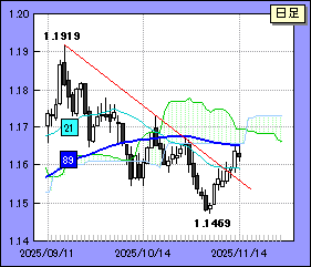 ユーロ・ドルの反発は89日移動平均線に阻まれた。もみ合い相場へ移行しそうな状況下、同移動平均線がその上限候補になり得る。ドル・円がこれを越えてくれば、もみ合い上限は1.1730レベルへ引き上げられる。89日線は目先、1.1655付近で横ばい推移しそうだ。