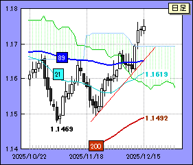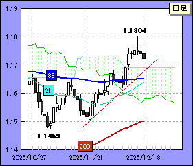 下値に関してはサポートライン突破が修正反落のきっかけとなり得る。ただし、ユーロ・ドルが21,89日移動平均線を下回らない限り、堅調地合いは維持される。下回れば、上昇力が弱まりもみ合い色が深まりそうだ。下値の目処は200日移動平均線。今後、1.1510/15付近を上がってくると予想される。