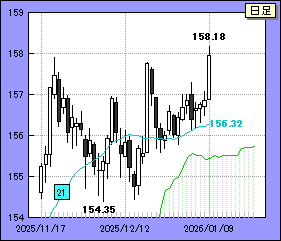 ドル・円は今朝の市場で一時、157.25付近まで上昇する場面があった。昨年末に抜けなかった157.00を越えて上げ幅を拡大しようかという動きだ。ただ、現時点ではもみ合い相場が依然、継続中と判断される。しかし、158.00レベルが突破されるとドル・円がもみ合い圏から上抜けしたと見てドル買い圧力が強まろう。この時の上値ターゲットは158.88。さらに、161.95も視野に入ってくる。