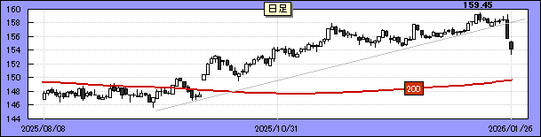 ドル・円は先週末から急速に値を崩し昨日、153.30まで下落した。上図を見ても分かる通り、145円台から続いた上昇の流れが急変。下値リスクが高まりつつある。