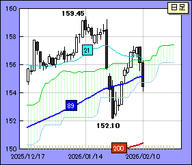 ドル・円が157.40ブレイクに失敗すれば、上げ一服となって一旦、反落しそうだ。下値に関してサポートは89日線。目先、155.20/30レベルを上がってくると予想される。破られると日足雲下限が試される。同下限は月曜日から木曜日まで154.73で横ばいとなる。
