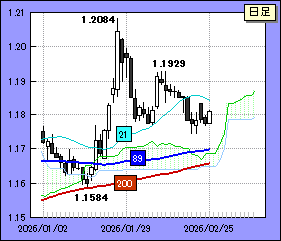 目先の注目ポイントは3本の移動平均線を巡っての挙動。相場の上昇を阻むであろう、21日移動平均線は1.1825/35付近で推移すると見られる。破られると1.1930レベルを試す動きに要注意だ。逆に、破られないようだともみ合い相場の様相が深まりそうだ。このときのもみ合い下限の目処は89,200日移動平均線。89日線は目先、1.1705付近で横ばい気味に推移しそう。200日線は1.1660/65レベルをなだらかに上がってくると予想される。両者が破られると1.1584への下落余地が生じる。