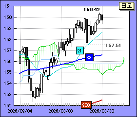 ドル・円は先週金曜日に160.42まで上昇。その後はやや伸び悩んでいるものの、21日移動平均線より上で推移しており堅調地合いが継続していると解釈される。この流れが続く限り、上値を目指す動きに油断できない。160.42ブレイク後のターゲットは161.95だ。