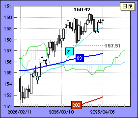 ドル・円は依然としてもみ合い相場が継続している。一昨日、前日からギャップを空けて21日移動平均線を下抜け157.89まで下落したものの、フォローのドル売りが続かず。昨日には21日線付近を回復する場面があった。この結果、同移動平均線を跨ぐ動きが鮮明となりもみ合い相場の特徴がチャート上に現れた。