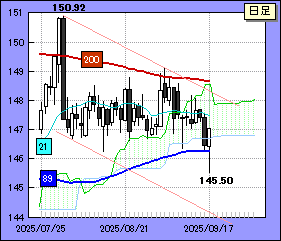 89日線ブレイクは一時的なものに終わりクリア・ブレイクに成功したとは言い難い状況だ。ただ、一時的にせよ、同移動平均線を大きく下抜いた事実は無視できない。したがって、ドル・円が21日移動平均線より下で推移する間は下値リスクがくすぶり続けるので145.50突破に警戒を要する。同水準突破後のターゲットは左図に示したチャンネル下辺。これも破られると142.69への続落リスクに気をつけたい。