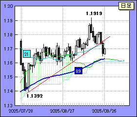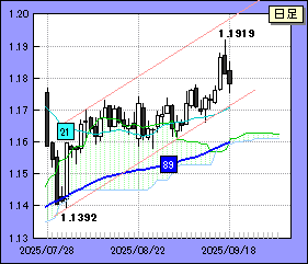 ユーロ・ドルは一昨日、長期チャンネル(9/17の記事参照)を一時的に上抜け1.1919をつけたものの、1.19台は短命に終わった。昨日は1.17台半ばまで反落。一段高に向かって弾みをつけることができなかった。