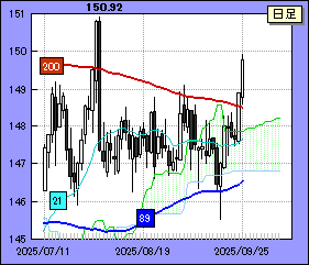 ドル・円が下げ渋って21日線を絡んでくるようだと相場のもみ合い色が再び濃くなる。このときの上値ポイントは想定されるチャンネル上辺、或いは200日移動平均線だ。200日線は目先、148.60/65レベルを下がってきそうだ。200日線が破られると150.92を狙う動きに要注意となる。