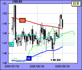 もみ合い圏上限となる200日線は目先、148.70近辺をなだらかに下がってくると予想される。もみ合い圏下限の89日線は146.28付近で横ばい推移しそうだ。ドル・円がもみ合い圏から抜けたあとの短期ターゲットもこれまで通りの見方で変わらない。上値は150.92、下値は142.69となろう。