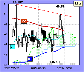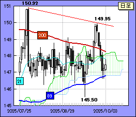 下値に関しては200,21日移動平均線がサポート。前者は目先、148.45/50付近を下降、後者は147.80/148.00ゾーンを上がってくると予想される。ドル・円が21日線に絡めば反発力が鈍り再びもみ合い色を帯びる。