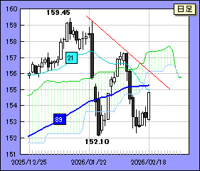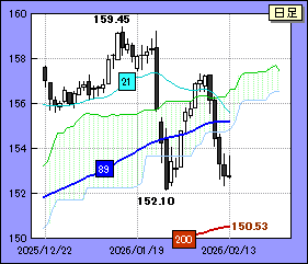 152.10がホールドされる(破られない)と流れはもみ合いへと移行しそうだ。想定されるもみ合い圏上限は89日移動平均線付近か。同移動平均線は目先、155.30/35付近で推移すると予想される。破られると157.30レベルへの上値余地に気をつけたい。