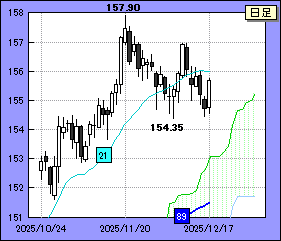 これまでの動きを見る限り、ドル・円のもみ合い相場が続いているようだ。想定されるもみ合い圏は154.35/157.00ゾーン。ただし、21日移動平均線がうまくドル・円の反発を押さえ込むようだと下落リスクが高まる。154.35突破後のターゲットは153.60レベル、或いは152.85レベルだ。21日線は目先、おそらく155.90/156.00近辺で推移すると予想される。