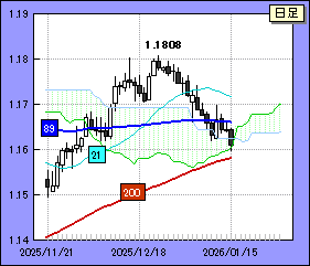 下値に関しては21日移動平均線がサポート。ここ二週間ほど同移動平均線がうまく相場を下支えてきた。しかし、ドル・円が絡んでくるようだとドル買い圧力が弱まりそうだ。ただ、相場のもみ合い色が深まるだけなので下値は限定的か。日足雲上限がサポートになろう。同上限は155.52(月)155.46(火)、155.52(水)に位置する。