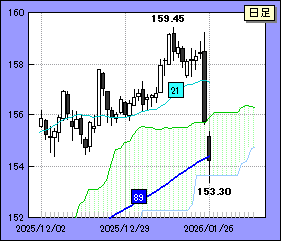 ドル・円は先週末から急速に値を崩し昨日、153.30まで下落した。上図を見ても分かる通り、145円台から続いた上昇の流れが急変。下値リスクが高まりつつある。