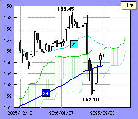ドル・円下落の一服感が広がりつつあることから下値は固くなりそうだ。サポートは89日移動平均線。目先、154.90/155.00付近を上がってくると予想される。その下、日足雲下限にも注目。同下限は154.09(水)、154.19(木)、154.70(金)に位置する。