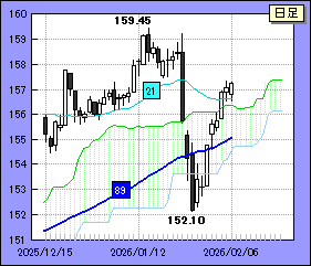 ドル・円が157.40ブレイクに失敗すれば、上げ一服となって一旦、反落しそうだ。下値に関してサポートは89日線。目先、155.20/30レベルを上がってくると予想される。破られると日足雲下限が試される。同下限は月曜日から木曜日まで154.73で横ばいとなる。