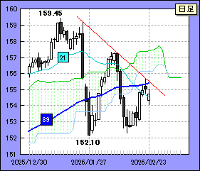 先週半ばから上値を追っていたドル・円は金曜日に155.65へ上昇。しかし、同水準付近にあった抵抗線に阻まれ伸び悩んだあと昨日、154.00まで反落した。ドル上伸を止めた89日移動平均線と抵抗線は今後も強いレジスタンスになりそうだ。ドル・円が一段高となるためには両者のうち上位にある、89日線を越えなければならない。同移動平均線は目先、155.50/55付近を上昇すると予想される。突破後のターゲットは157.40だ。