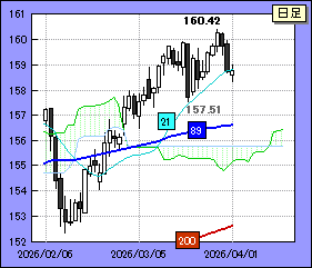 ドル・円は先週金曜日に160.42まで上昇。その後はやや伸び悩んでいるものの、21日移動平均線より上で推移しており堅調地合いが継続していると解釈される。この流れが続く限り、上値を目指す動きに油断できない。160.42ブレイク後のターゲットは161.95だ。