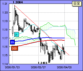 ユーロ・ドルが昨日、1.14台半ばで下値を固めたあと反発、1.1563まで上昇した。今朝の市場では1.1580レベルに迫る場面があった。21日移動平均線と抵抗線(チャンネル上辺)を試す動きだ。21日線は本日、終値が1.1554ならば同じ値をとる。抵抗線は本日、1.1570にあって今後、一日約0.0011ずつ下がっていく。両者がクリアに破られるかどうか微妙な局面だが、いつ突破されてもおかしくない。破られるとユーロ下落一巡感が広がりユーロ買いが入りやすくなる。そうなれば、強い抵抗帯になるであろう、89,200日移動平均線が試される。目先、89日線は1.1705付近で、200日線は1.1678付近で横ばい推移すると予想される。