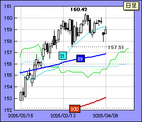 ドル・円は依然としてもみ合い相場が継続している。一昨日、前日からギャップを空けて21日移動平均線を下抜け157.89まで下落したものの、フォローのドル売りが続かず。昨日には21日線付近を回復する場面があった。この結果、同移動平均線を跨ぐ動きが鮮明となりもみ合い相場の特徴がチャート上に現れた。