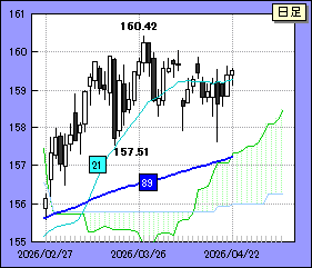 もみ合い色が濃い中、当面の読みはこれまで通りボックス圏で売り買いが交錯する展開が予想される。ボックス圏の上限は160.42、下限は157円台半ばだ。ボックス圏からはみ出したときのターゲットも変わらず、上値は161.95、下値は89日移動平均線。同移動平均線は目先、157.00/05レベルをなだらかに上がってくると見られる。